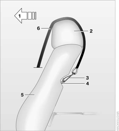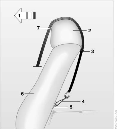 2. Guide the upper retaining strap between the supports of the head restraint.